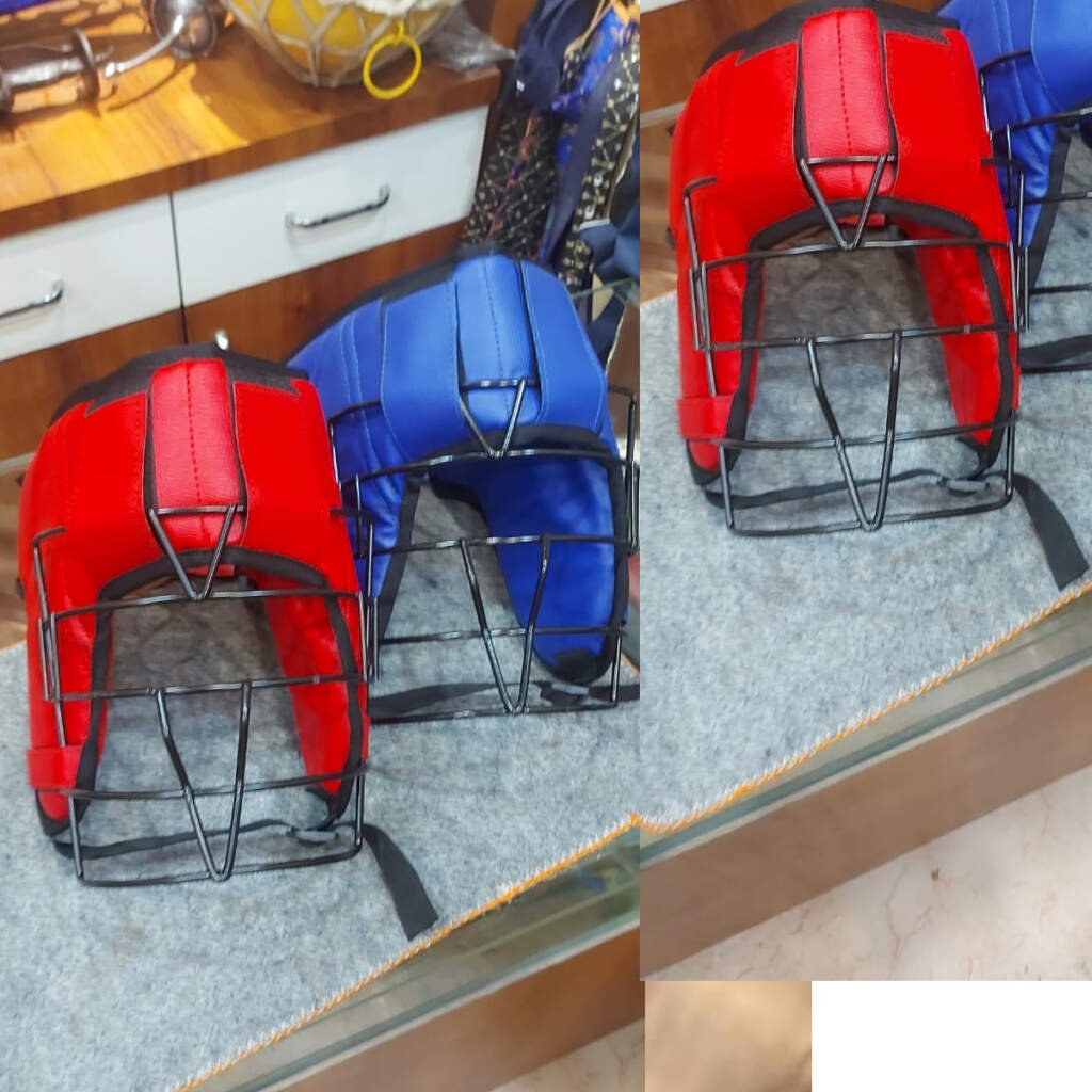 This protective martial arts head guard is designed to offer enhanced safety during sparring and controlled contact training. Featuring thick inner padding and a sturdy metal face cage, it protects critical facial areas while maintaining comfort and breathability.