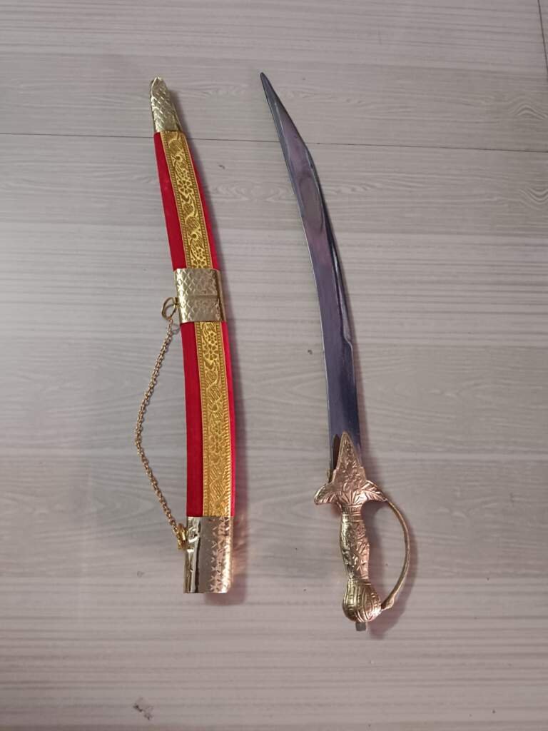 This is a beautifully crafted 1-foot gold-finish sword, safely kept in a traditional wooden pouch. The compact size makes it perfect for ceremonial use, gifting, or as a decorative piece symbolizing honor, tradition, and Tamil warrior pride